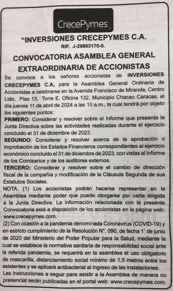 CONVOCATORIA ASAMBLEA DE ACCIONISTAS INVERSIONES CRECEPYMES EN PRENSA 08/03/2021